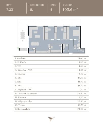 Penthouse s celkovou rozlohou 173,90 m² (interiér 105,60 m² + terasa 68,70 m²) ponúka výnimočne veľkorysé riešenie: