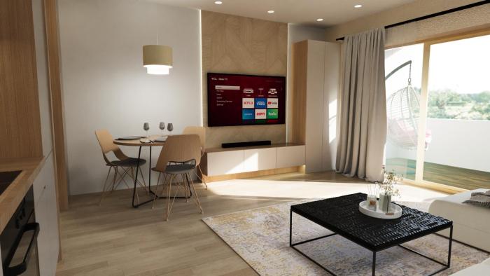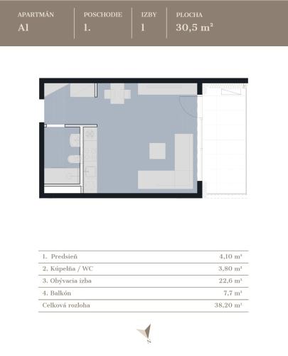 Apartmán sa nachádza na 1. nadzemnom podlaží a ponúka efektívne riešený priestor s dôrazom na funkčnosť a svetlo: