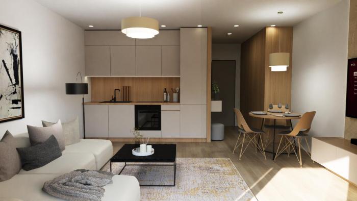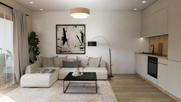 Obytná miestnosť s kuchynským kútom (19,90 m²) – kompaktný, no plnohodnotný priestor na bývanie aj prenájom