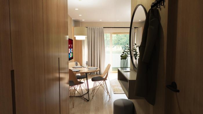 Apartmán sa nachádza na 2. poschodí a ponúka efektívne riešený priestor s dôrazom na funkčnosť a svetlo: