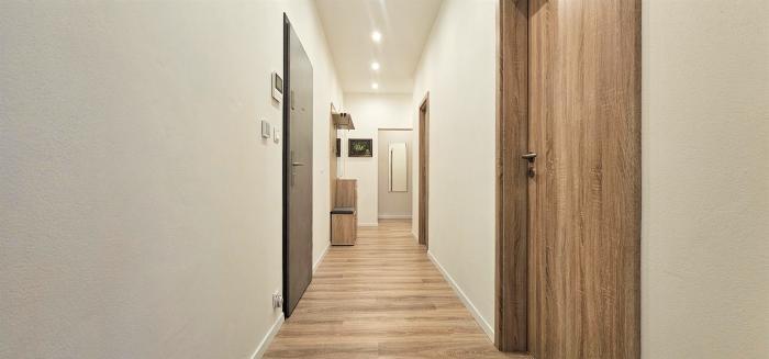 Po vstupe do bytu cez protipožiarne bezpečnostné dvere nasleduje chodba spájajúca všetky miestnosti v byte. Na jej konci vpravo sa nachádza kuchyňa s jedálňou a obývacou izbou s výstupom na terasu (15 m2). Uprostred chodby sa nachádza spálňa, ďalej vľavo je technická miestnosť s hosťovskou toaletou, umývadlom a el. bojlerom. Vedľa je priestranná kúpeľňa s oknom, vaňou, sprchovým kútom, rebrinovým radiátorom a druhou toaletou. Na opačnom konci chodby vľavo sa nachádza tretia izba so šatníkom a výstupom na terasu. Terasa západnej orientácie je po celej šírke bytu a poskytuje vlastníkovi fascinujúce výhľady na okolitú prírodu, hladinu Sĺňavy a Karpaty. Byt sa predáva s pivnicou 5 m2, ktorá sa nachádza na prízemí domu, a vonkajším parkovacím státím 17 m2.