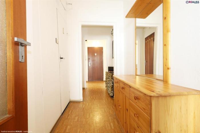 Opis: byt má skvelé vybavenie, jeho veľká metráž poskytuje dostatok priestoru. Byt pozostáva zo vstupného zádveria prechádzajúceho plynule do centrálnej chodby, samostatnej izby pri vstupe, skutočne veľkej obývačky ( 3,5x5,7m ) s príjemným výhľadom z balkóna, šatníka v ktorom je priestor pre práčku a sušičku, kúpeľne so samostatnou toaletou, praktickej kuchyne s veľkým jedálenským kútom. K vybaveniu bytu patrí okrem balkóna, šatníka, veľkej komory aj priestranná, uzamykateľná pivnica v suteréne bytového domu, ktorá predstavuje ďalší úložný priestor.