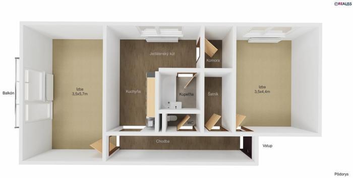 Dispozícia: 2 x izba + kuchyňa, kúpeľňa, WC, chodba, šatník, komora - 11 posch. z 11