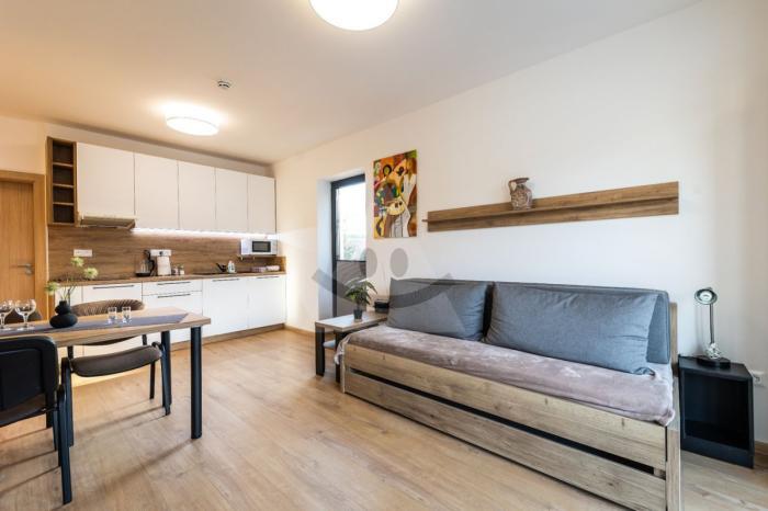 Dispozične pozostáva z: predsiene, kúpeľne spojenej s WC, priestorovo veľkorysej obývačky s kuchynským kútom, izby.