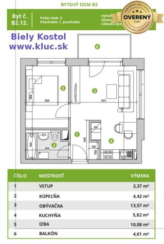 Byt sa nachádza na 2.podlaží / 4.p. Výmera bytu je 37,3m2 + balkón 4,6m2= 41,9m2. Byt nemá pivnicu, ale na prízemí je kočikáreň aj pre odkladanie bicyklov.. Byt je kompletne moderne zariadený. Kuchyňa je prepojená s obývačkou (19m2), má balkón. Kúpeľňa (4,2m2) má vaňu a toaletu. Spálňa (10m2) je samostatná.