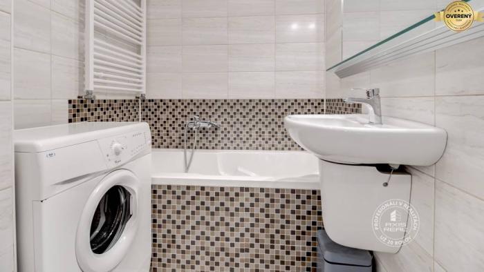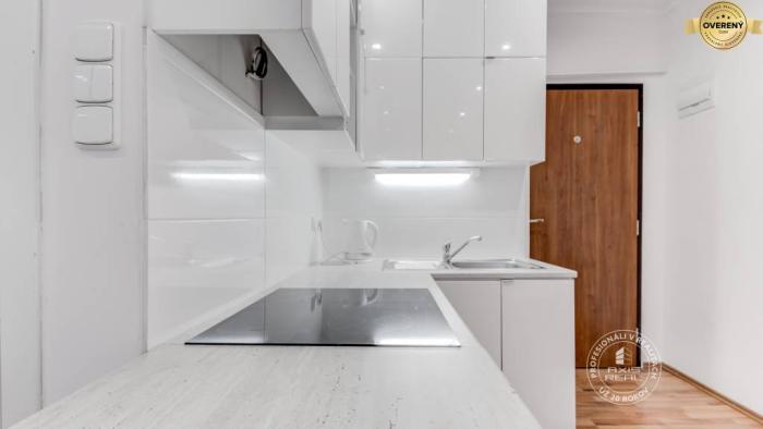 Zrekonštruovaný byt. Plastové okná s interiérovými žalúziami, laminátová podlaha v izbe, dlažba v kúpeľni. Byt je ZARIADENÝ nábytkom (zrkadlové vstavané skrine pozdĺž celej steny, ktoré zabezpečujú dostatok úložného priestoru, stolíky, kreslo) a spotrebičmi (v kuchynskej linke je zabudovaná elektrická varná doska a elektrická rúra, chladnička je umiestnená vo vstavanej skrini, nová práčka so sušičkou je v kúpeľni, k dispozícii je aj vysávač), aj riadmi. V izbe je NOVÁ KVALITNÁ rozkladacia sedačka (plocha lôžka je 160 cm x 200 cm). V kúpeľni je vaňa a je spojená s toaletou.