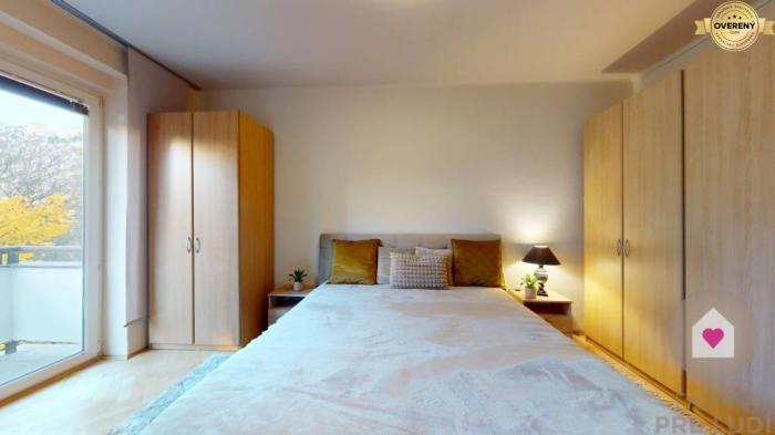 - priestrannou spálňou s manželskou posteľou s matracom, 2 x nočným stolíkom, kreslom, stojacou lampou a 3 šatníkovými skriňami. Vychádza sa z nej na balkón orientovaný do tichého vnútrobloku s množstvom zelene , ktorý zväčšuje plochu bytu o 4,2 m2,
