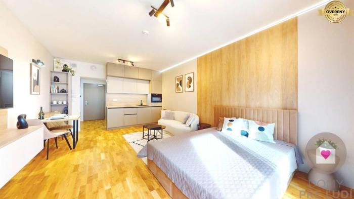 - priestrannej obývacej izby s dizajnovou pohovkou spojenej so spálňovou časťou s Boxspring posteľou a pracovným stolom