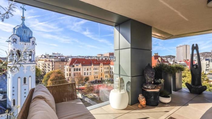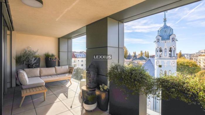 Dispozíciu bytu tvorí vstupná chodba, ktorá už pri vstupe okamžite zaujme pohľadom na Modrý kostolík a nádherné presvetlenie bytu, samostatný veľký walk-in šatník, hosťovská toaleta s práčkou a sušičkou. Nádherná otvorená dispozícia dennej obývacej izby so vstupom na terasu, priestranný kuchynský kút s jedálenským stolom, elegantná chodba tvorená "živou" zelenou stenou, ktorá spája dennú časť bytu s nočnou, veľký samostatný šatník s balkónom, master bedroom s prechodnou kúpeľňou s voľne stojacou vaňou a sprchovým kútom, druhá spálňa spojená s office kútikom. Všetky izby bytu vrátane kúpeľne sú krásne slnečné, západne orientované s výhľadom na secesný kostolík a veľkoryso presvetlené vďaka veľkoformátovým hliníkovým vákuovým oknám s výborným tienením prostredníctvom exteriérových hliníkových žalúzií alebo interiérových elektrických roliet. Celý interiér je klimatizovaný, má podlahové kúrenie a výmenu vzduchu rekuperáciou, štýlové bezfalcové drevené dvere dokonale ladia s obkladom stien a nadčasovými parketami.