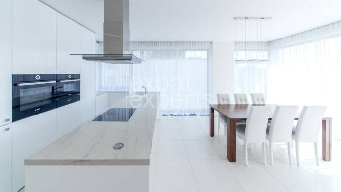 Vstupná hala, veľká obývacia izba spojená s plne vybavenou kuchyňou, 4 x spálňa, šatník, 3 x kúpeľňa s toaletou, samostatná toaleta, lodžia 5m2, terasa 15m2, pivničná kobka 6,50 m2.