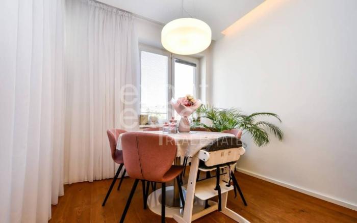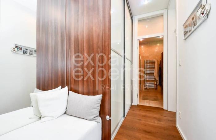Byt pozostáva zo vstupnej haly, obývacia izba s pohovkou a biokrbom, prepojená s plne zariadenou kuchyňou s jedálenským stolom a vstupom na lodžiu. Hlavná spálňa s manželskou posteľou a vstavanou skriňou a druhá detská izba/pracovňa. V kúpeľni sa nachádza kúpeľňa s vaňou, sprchovým kútom, 2 umývadlami a oddelená toaleta.