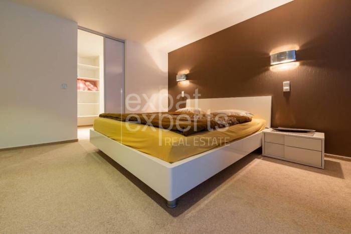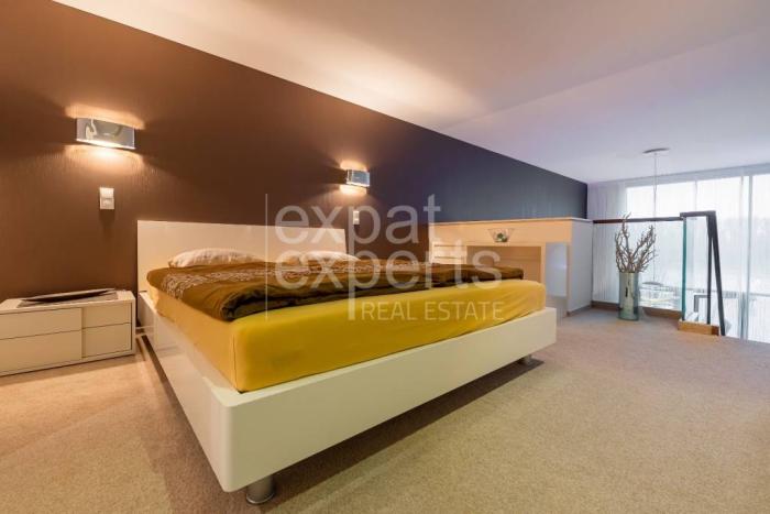 Vstupná hala, obývacia izba prepojená s kuchyňou s barovým pultom, kúpeľňa s vaňou a toaletou, práčovňa na poschodí, spálňa s vlastným šatníkom, priamy výhľad na Dunaj.