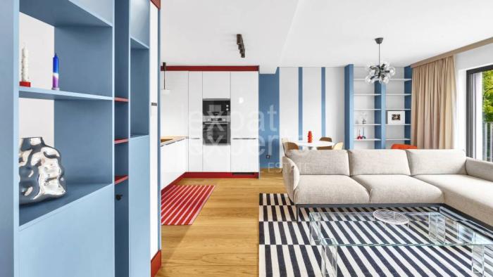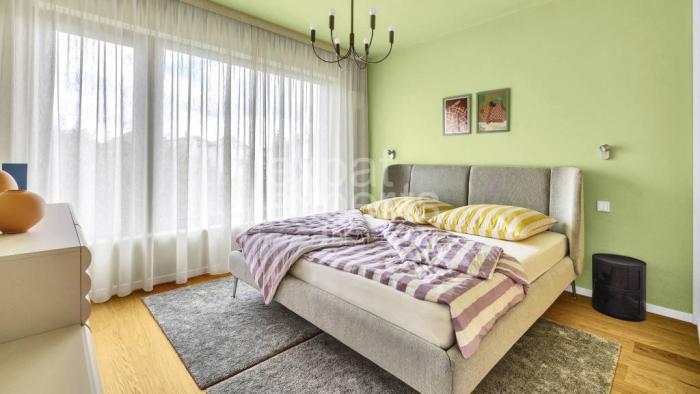 Byt je ÚPLNE NOVÝ, kompletne zariadený luxusným nábytkom na mieru a vybavený všetkými elektrospotrebičmi (chladnička s mrazničkou, elektrická rúra, mikrovlnná rúra, umývačka riadu, varná doska, práčka). Komfort zvyšuje podlahové chladenie a kúrenie, video vrátnik a klimatizácia.