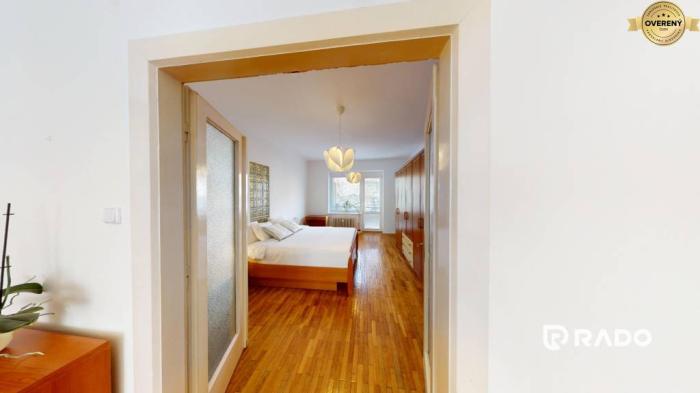 Veľkorysá spálňa s radom skríň + východ na balkón do dvora