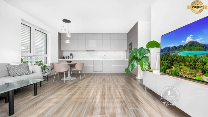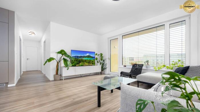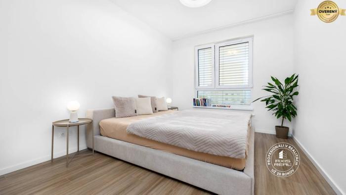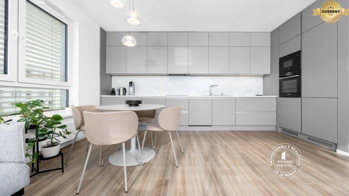 Byt sa nachádza v novostavbe skolaudovanej v roku 2023 a je zariadený moderne, prakticky a v príjemnom štýle, ktorý podčiarkuje svetlosť celého priestoru. Denná časť pozostáva z obývacej izby prepojenej s veľkou kuchyňou s dostatkom úložného priestoru a jedálenským stolom pre štyri osoby. Kuchyňa je vybavená kvalitnými vstavanými spotrebičmi zn. BOSCH – umývačkou riadu, indukčnou varnou doskou, elektrickou rúrou, digestorom a chladničkou s mrazničkou. O komfort sa stará klimatizácia, v samostatnej práčovni sa nachádza práčka (LG) a kúpeľňa je moderne riešená so všetkým potrebným.
