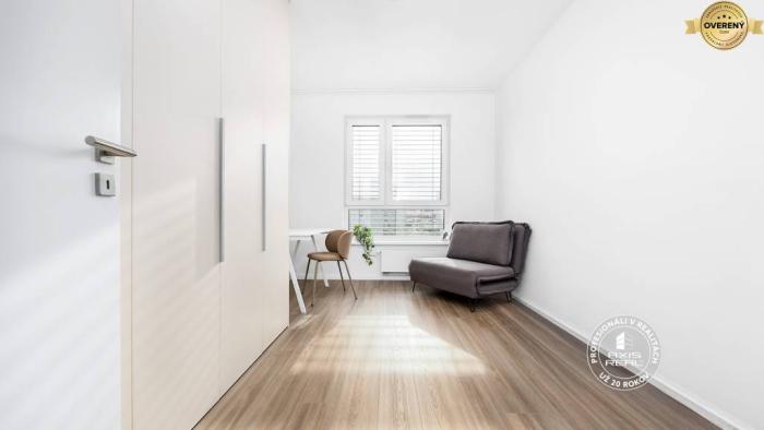 Spálňa je kompletne zariadená manželskou posteľou s nočnými stolíkmi a šatníkovou skriňou. Menšia izba bola využívaná ako pracovňa / hosťovská miestnosť. Celý byt pôsobí harmonicky a premyslene, s dôrazom na pohodlie, funkčnosť a príjemnú atmosféru.