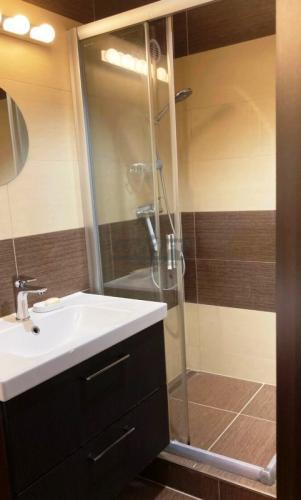 kúpeľňa so sprchovým kútom a práčkou,