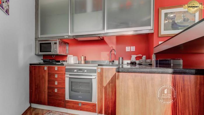 Kuchyňa je kompletne vybavená elektrospotrebičmi (chladnička, sklo-keramická varná platňa, elektrická a mikrovlnná rúra). Kúpeľňa je vybavená hydromasážnou rohovou vaňou, toaletou, bidetom a automatickou práčkou. Byt sa prenajíma kompletne ZARIADENÝ, je v ňom veľa úložného priestoru – 2 vstavané skrine sú v byte, jedna na spoločnej chodbe, sedačka, posteľ, koberec a pracovný stolík.