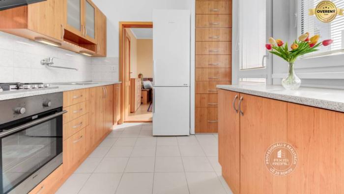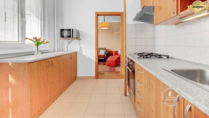 Zrekonštruovaný byt. V kuchyni je kuchynská linka s kombinovaným sporákom, prípojkou na umývačku riadu, chladničkou s mrazničkou a vstavanou šuplíkovou potravinovou skrinkou.