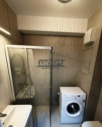 Kúpeľňa so sprchovacím kútom, toaletou a práčkou.