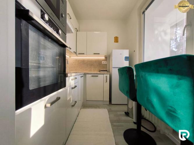 Kuchyňa je síce menšia, no veľmi praktická – vybavená vstavanými spotrebičmi ako elektrická rúra, mikrovlnná rúra a umývačka riadu. Barový pult pri okne s výhľadom je ideálnym miestom na rýchle raňajky alebo prácu s notebookom.