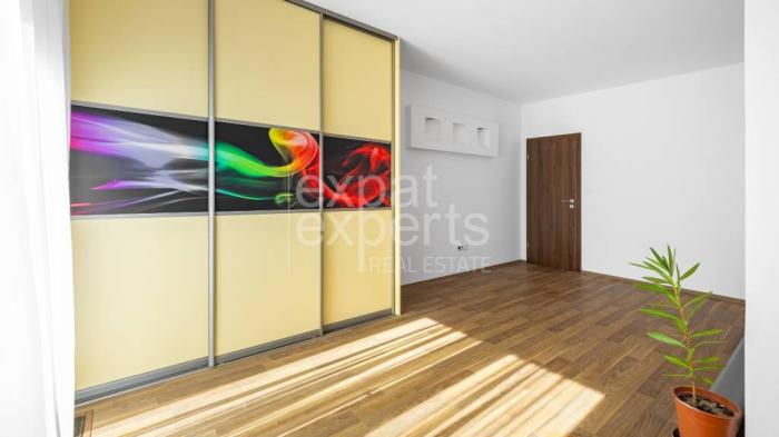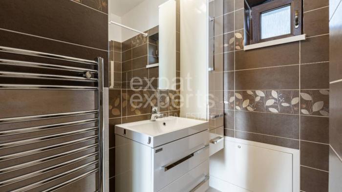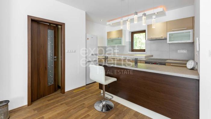 Byt sa prenajíma zariadený a vybavený elektrospotrebičmi a kuchyňou na mieru; kompletne vybavená kuchyňa (chladnička s mrazničkou, indukčná varná doska, rúra, digestor, mikrovlnná rúra...), ponúka všetko potrebné pre komfortné bývanie; dostatok úložného priestoru, úžasná terasa a predzáhradka.