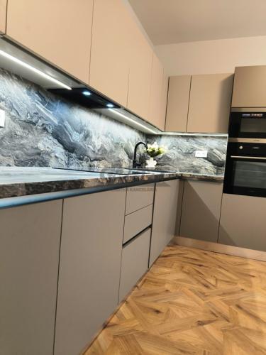 - moderná kuchynská linka je vybavená všetkými zabudovanými spotrebičmi – elektrická teplovzdušná rúra, elektrická sklo-keramická varná doska, digestor, zabudovaná chladnička s mrazničkou, umývačka riadu, zabudovaná práčka