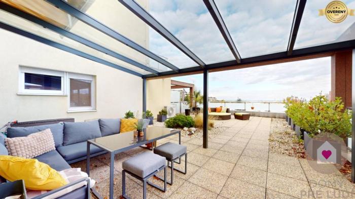 Byt disponuje vonkajšími žalúziami, terasou s protišmykovou mrazuvzdornou dlažbou a parkovaním na vlastných vyhradených garážových státiach odkiaľ sa do bytu dostanete suchou nohou. Benefitom je aj uzamykateľná pivničná kobka priamo na poschodí vedľa bytu ako ďalšia alternatíva úložného priestoru.