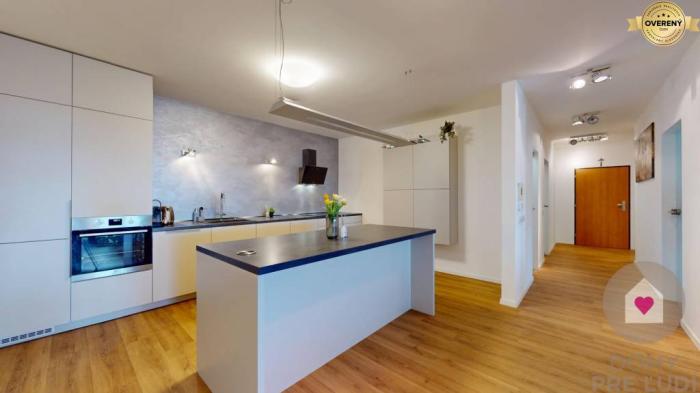 - Kuchynskej časti s modernou kuchynskou linkou robenou na mieru so zabudovanými spotrebičmi (chladnička s mrazničkou, umývačka riadu, varná doska, digestor, el. rúra). Výborným dispozičným riešením je samostatná technická miestnosť s práčkou, umývadlom a množstvom odkladacieho priestoru.