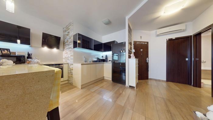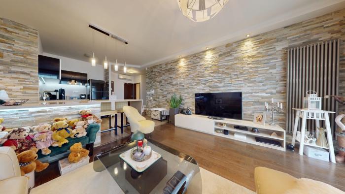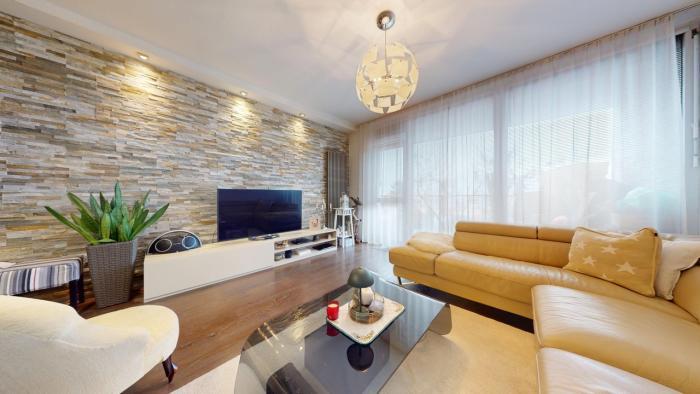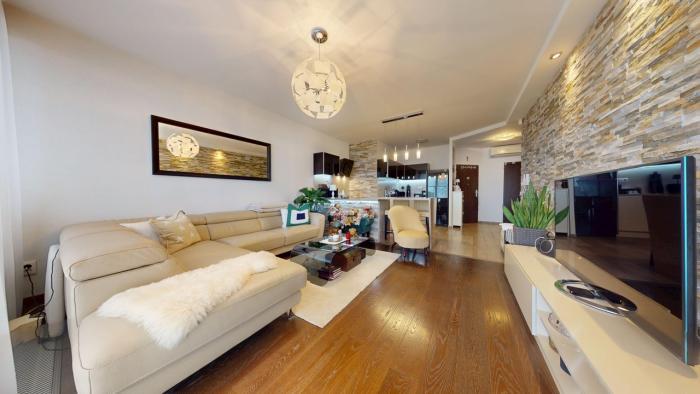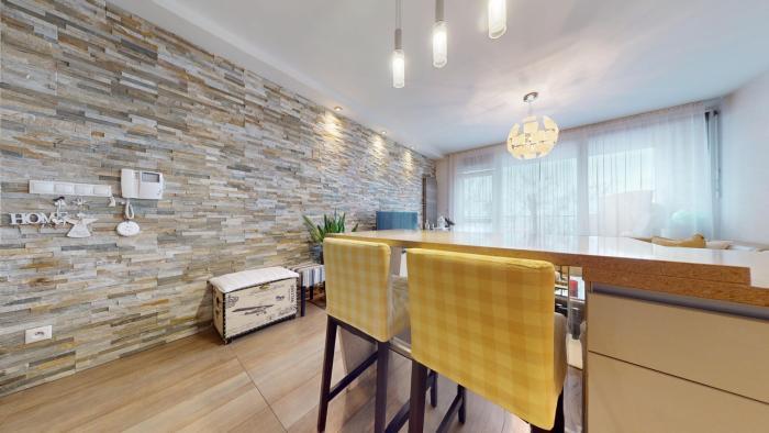 Štýlotvorným prvkom v interiéri bytu je prírodný kamenný obklad v príjemnom farebnom prevedení, bodové osvetlenie, kvalitné veľkoformátové parketové podlahy.
