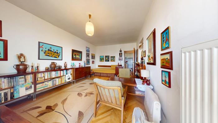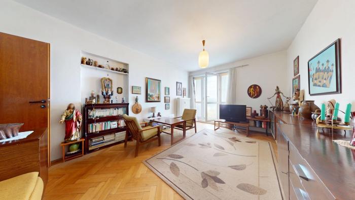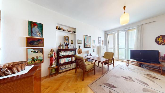 Byt je v pôvodnom, udržiavanom, ihneď obývateľnom stave, má plastové okná, pôvodné kvalitné drevené parketové podlahy (bez nutnosti výmeny), klasické, čiastočne presklenené interiérové dvere. Dispozične byt pozostáva zo vstupnej časti, samostatnej kuchyne s praktickou špajzou a dostatkom priestoru na jedálenské sedenie, dvoch samostatných nepriechodných izieb, kúpeľne s vaňou a oddelenej toalety. Byt má balkón z obývačky a patrí k nemu pivnica v suterénnych priestoroch domu o výmere 1,15m2.