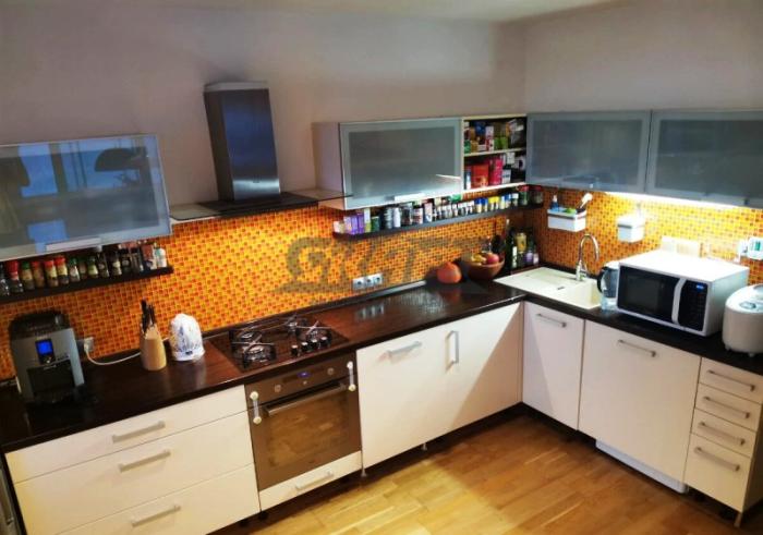 vstupná hala, šatník, 2 nepriechodné spálne (1 s walk – in šatníkom), samostatná obývacia izba spojená s kuchyňou (práčka, umývačka riadu, chladnička s mrazničkou) a výstupom na priestrannú zasklenú lodžiu, samostatná kúpeľňa (vaňa, sprchovací kút), samostatné WC.