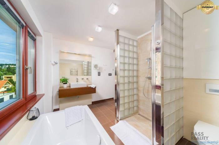 Kúpeľňa vyniká svojou priestrannosťou a zriedkavými výhľadmi až na Alpy. Ponúka vaňu aj sprchovací kút, čo prináša maximálnu flexibilitu a komfort.