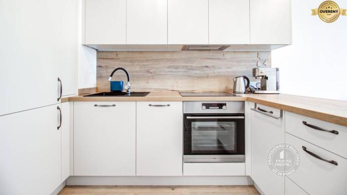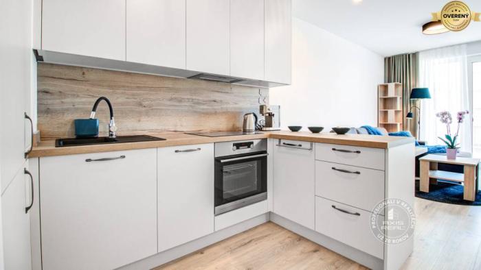Byt je KOMPLETNE ZARIADENÝ a MODERNE VYBAVENÝ. V byte sú všetky spotrebiče kvalitných značiek, chladnička s mrazničkou, umývačka riadu, indukčná varná doska, digestor, elektrická rúra, práčka, vysávač, taniere, poháre a základné vybavenie.