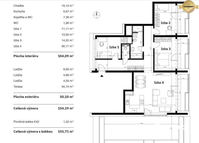 -Interiér: 104 m² + exteriér: 50 m² – dokopy 155,71 m²
