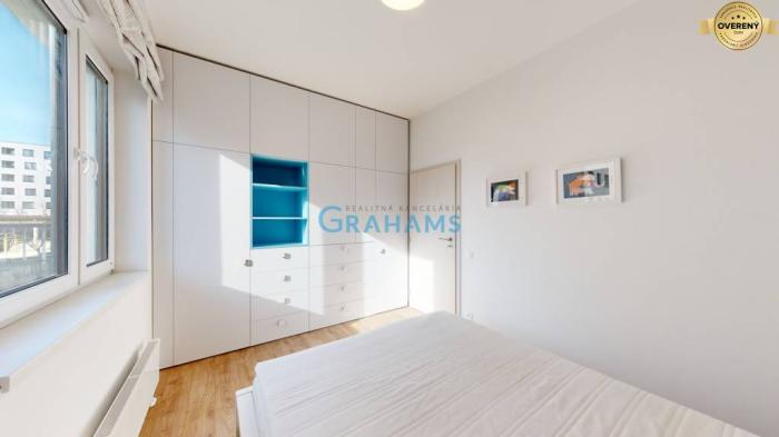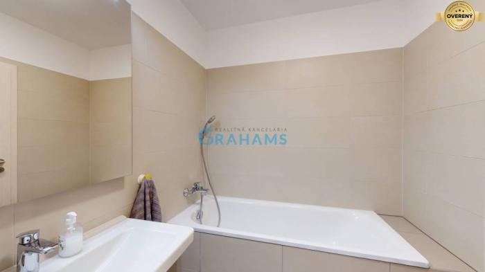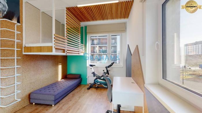 Vybavenie - Byt je kompletne vybavený. Kuchyňa disponuje vstavanými spotrebičmi (indukčná varná doska, elektrická rúra, umývačka riadu, digestor, chladnička). V byte sú na podlahe laminátové parkety. V kúpeľni je pračka so sušičkou.