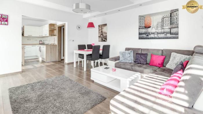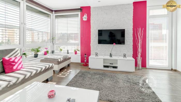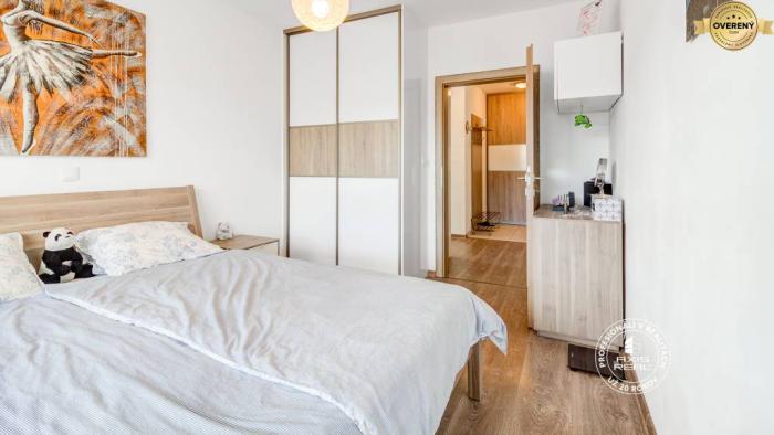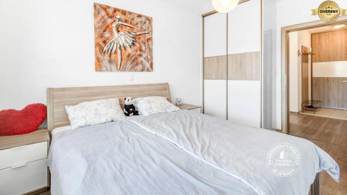 Byt sa nachádza v novostavbe s VÝŤAHOM na 5. poschodí celkovo z 10 poschodí. Dispozične pozostáva z predsiene, obývačky spojenej s kuchyňou, balkóna a samostatnej spálne. Izby sú nepriechodné, balkón je prístupný z obývačky, aj kuchyne. Kúpeľňa má vaňu, WC je samostatné. Byt s novou kuchynskou linkou je vybavený spotrebičmi: sporák, elektrická rúra, chladnička s mrazničkou, umývačka, mikrovlnka, pračka.