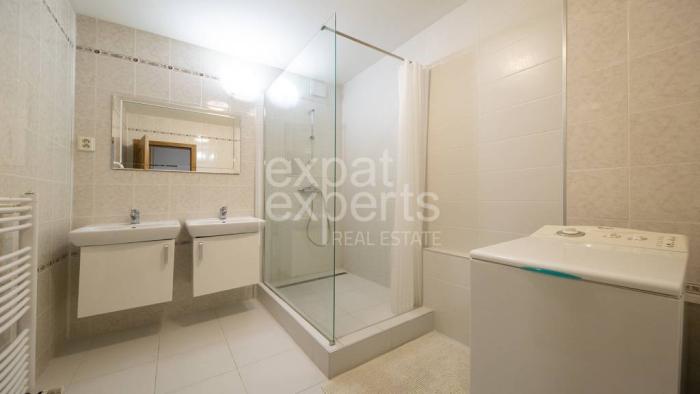Kúpeľňa má rozlohu 5,40 m² a je vybavená sprchovým kútom a dvomi umývadlami, čo je praktické najmä pre domácnosti s viacerými členmi. Samostatná toaleta má plochu 1,55 m².