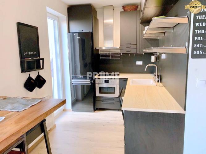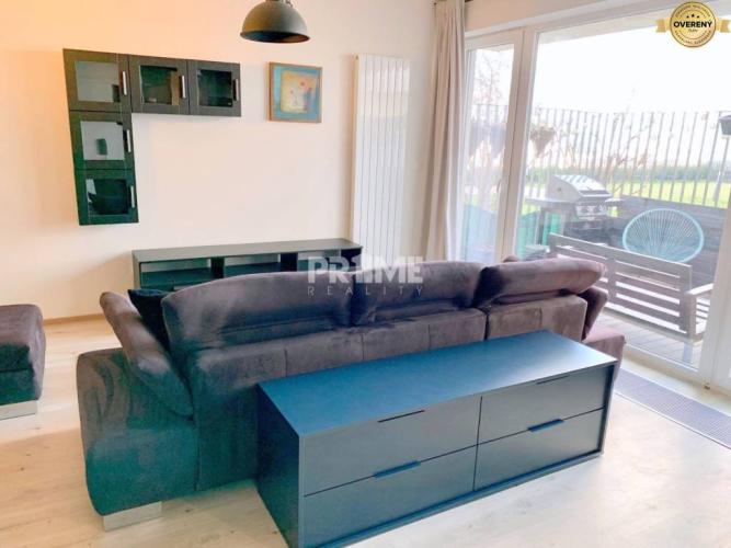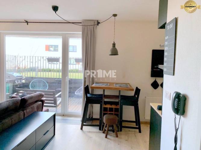 obývačka s kuchyňou, spací kút, kúpeľňu s vaňou, terasa, pivnica a garážové parkovacie státie. Zariadenie a výbava bytu umožňujú okamžité nasťahovanie. V rámci bytu sa nachádzajú kuchynské spotrebiče vrátane umývačky, pračka a plynový gril na terase.