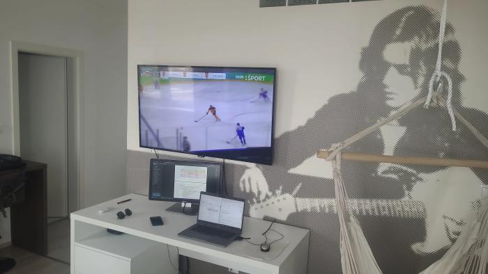 Vybavenie: rohová kuchynská linka so vstavanými spotrebičmi, barový stolík, kúpeľňa s vaňou a závesným WC, práčka so sušičkou, smart TV, bezpečnostné dvere