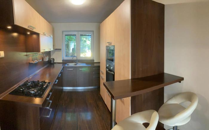 Kuchyňa: Zabudované spotrebiče – chladnička, umývačka riadu, mikrovlnka, rúra, jedálenský pult s 2 barovými stoličkami