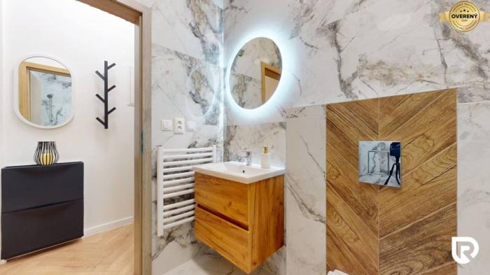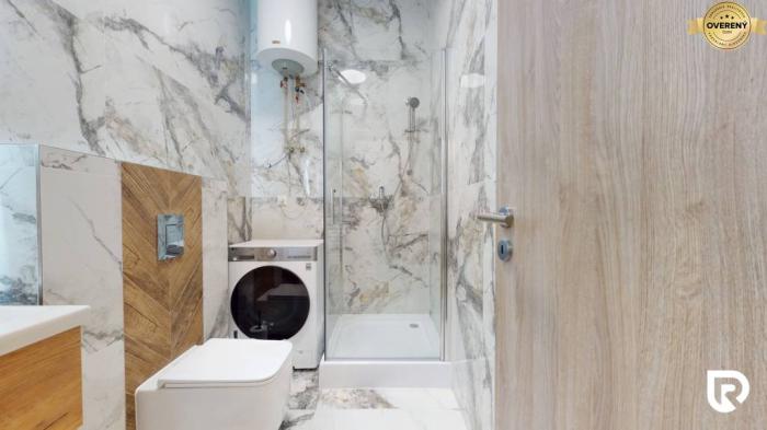 Kúpeľňa je zariadená z prémiových materiálov vrátane mramora, ktorý dodáva luxusný vzhľad. Nájdeš v nej sprchový kút, vlastný elektrický bojler na ohrev vody a práčku so sušičkou značky LG.