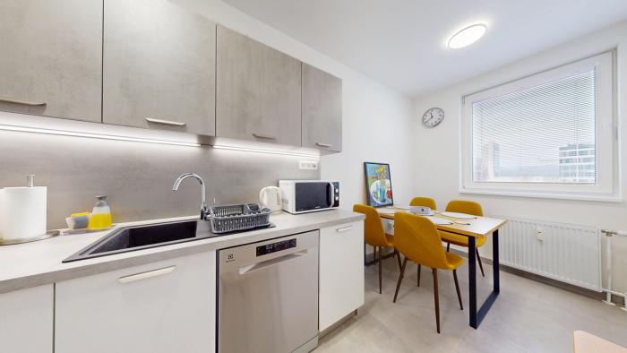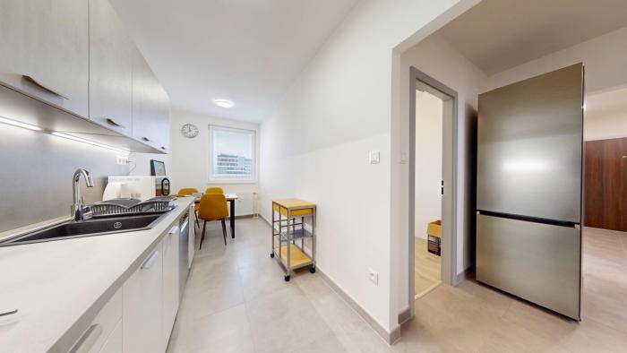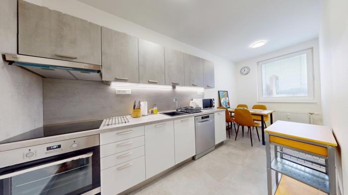 Byt má praktické dispozičné riešenie s dôrazom na funkčné využitie priestoru, čisté línie a prepracovanosť detailov. Pozostáva zo vstupnej haly, troch samostatných nepriechodných izieb, veľkej kuchyne s dostatkom miesta na jedálenské sedenie, komfortnej kúpeľne so sprchovým kútom, oddelenej toalety, priestrannej zasklennej loggie so vstupom zo spálne....K dispozícii je elegantná kuchynská linka na mieru so vstavanými spotrebičmi a veľká, samostatne stojaca chladnička s mrazničkou. Úložný priestor je riešený formou šatníkových systémov rolldoor v hale a v spální.
