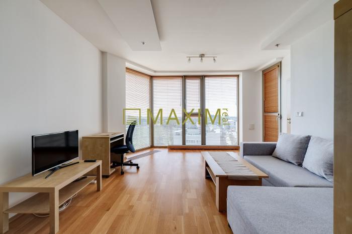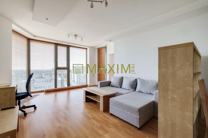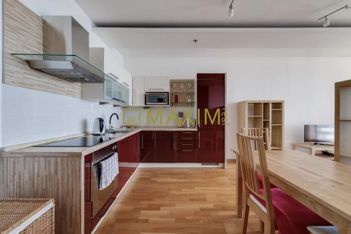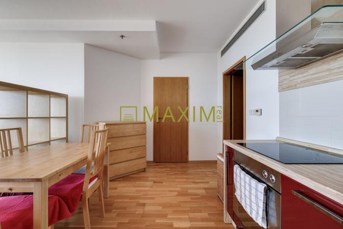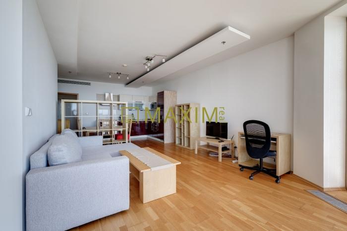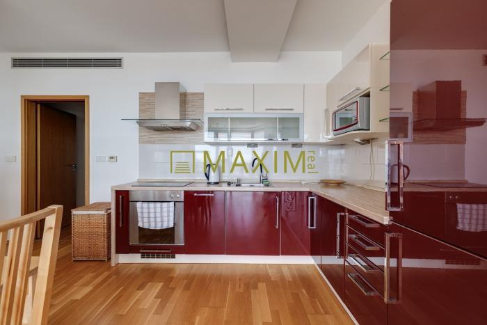 Dispozícia bytu pozostáva zo vstupnej chodby s priamym prechodom do obývacej izby spojenej s kuchyňou. V kuchyni sa nachádza kuchynská linka DEKODOM v tvare L so vstavanými spotrebičmi (el. varná doska, digestor, umývačka riadu, el. rúra, chladnička s mrazničkou). Z obývacej miestnosti sa dostaneme do spálne samostatnými dverami, alebo cez priestranný šatník. Z obývacej izby je tiež výstup na loggiu. Z chodby je vstup do priestrannej kúpeľne s vaňou, WC, bidetom a práčkou. Dostatok denného svetla zabezpečujú panoramatické okná a ku komfortu prispieva aj klimatizácia, protipožiarny systém a vykurovanie pomocou podlahových konvektorov.