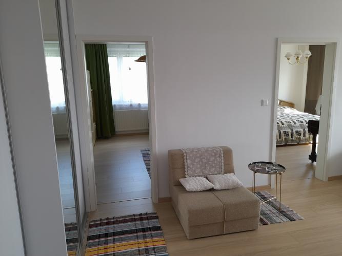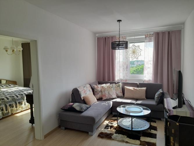 Prvá izba – veľká spálňa je samostatná. Vybavená manželskou posteľou. Druhá izba – malá spálňa má jednu posteľ, je nepriechodná a tiež samostatná. Tretia izba - obývačka je priechodná. Ostatné miestnosti bytu sú kuchyňa, kúpeľňa, wc, hala, chodba a zasklená lodžia. Celková rozloha - 70 m2. Celý byt je kompletne zariadený nábytkom a vybavený spotrebičmi ako chladnička, plynový sporák, mikrovlnka, elektrická rúra, umývačka riadu, práčka, TV. Klimatizačné zariadenie. Kúpeľňa je vybavená vaňou. Dostatok úložného priestoru. Stačí sa iba nasťahovať.