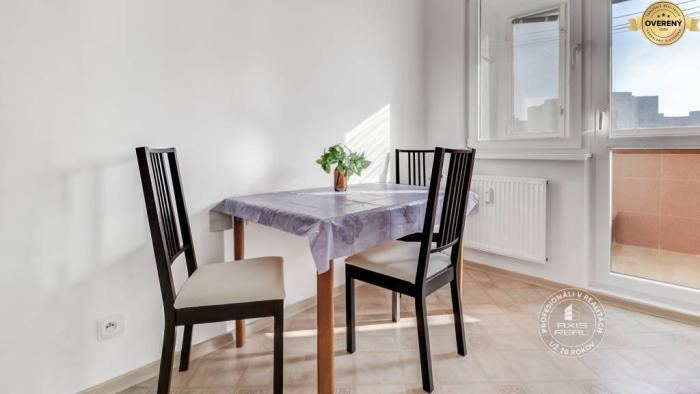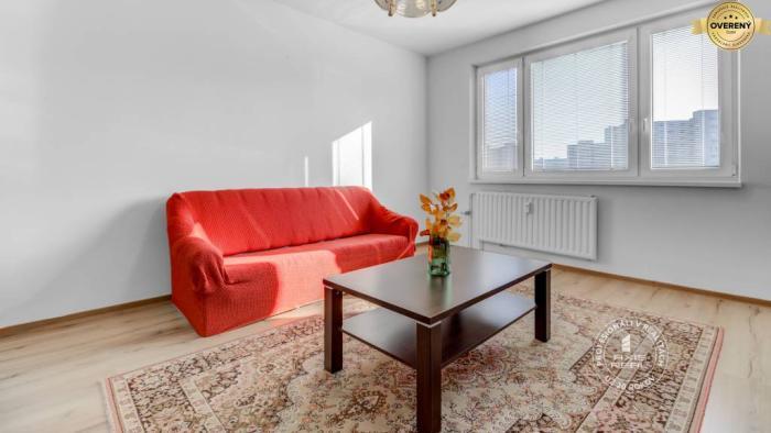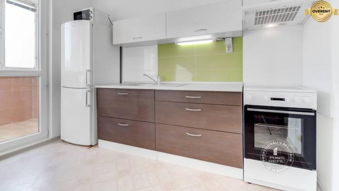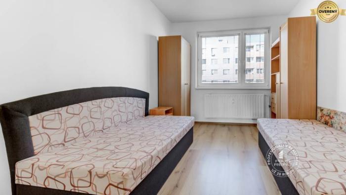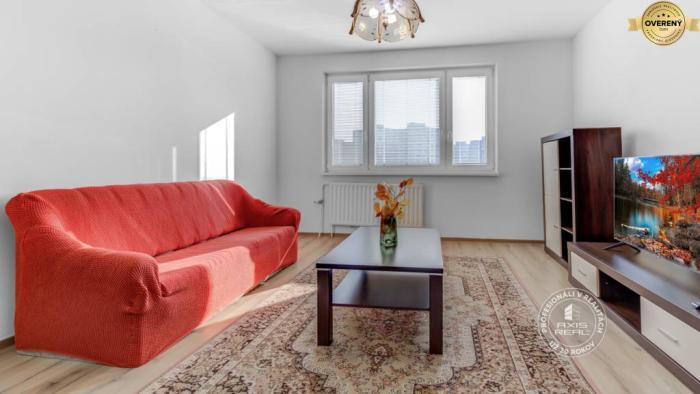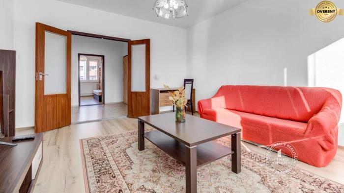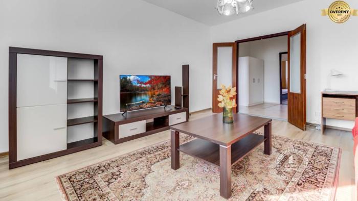 Rekonštruovaný byt. Zasklená lodžia, plastové okná so žalúziami v celom byte, stierky, laminátové podlahy, lino v kuchyni a v chodbe, dlažba v kúpeľni a WC. Kuchynská linka je vybavená spotrebičmi (elektrický sporák s 3 varnými zónami a rúrou, chladnička s mrazničkou). V spálni sú nové skrine s posuvnými dverami, manželská posteľ a písací stôl. Byt sa prenajíma kompletne ZARIADENÝ (v obývacej izbe je aj televízor).