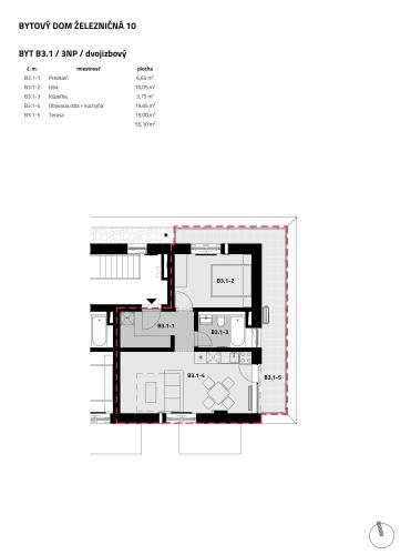 Byt sa nachádza na 2. poschodí (bez výťahu) a dispozične pozostáva z predsiene (6,65 m²), obývacej izby s kuchyňou (19,65 m²), spálne (10,05 m²) a kúpeľne s toaletou (3,75 m²). K bytu prislúcha terasa s výmerou 15 m².