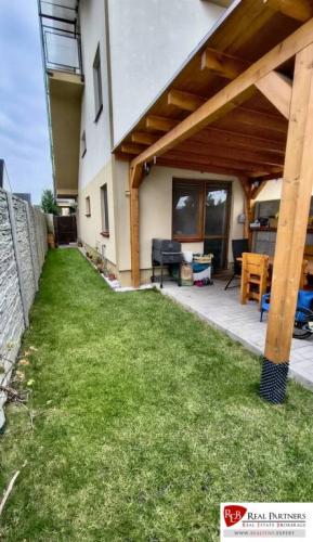 K bytu prislúcha vlastná oplotená záhrada s rozlohou 60 m². Je vybavená automatickým zavlažovaním a dreveným altánkom s posedením – ideálnym miestom na relax, stretnutia s rodinou či priateľmi alebo víkendové grilovanie. Priamo pred domom sú k dispozícii dve vyhradené parkovacie miesta, ktoré sú zahrnuté v cene.