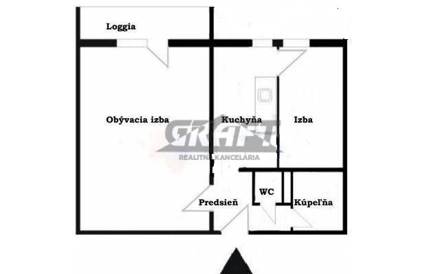 vstupná chodba, kúpeľňa so sprchovým kútom, samostatné WC, kuchyňa, obývacia izba s výstupom na loggiu a spálňa