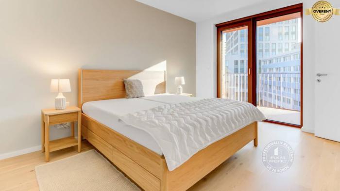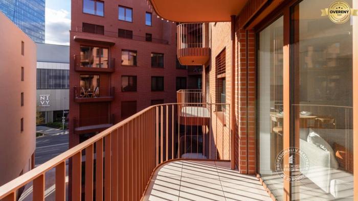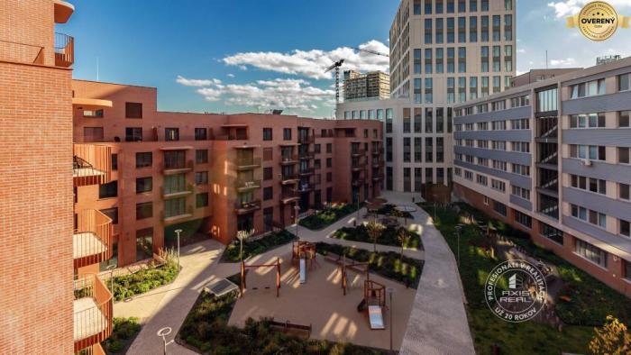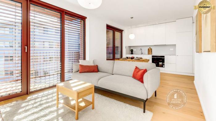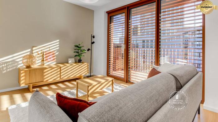 Realitná kancelária AXIS REAL ponúka na prenájom ÚPLNE NOVÝ KRÁSNY zariadený 2-izbový BYT s 2 VEĽKÝMI BALKÓNMI a vyhradeným miestom v PODZEMNEJ GARÁŽI vo vychýrenej novostavbe ZWIRN v lokalite Bratislava II. Ružinov na ulici KOŠICKÁ pri najmodernejšom a najlepšom nákupnom centre NIVY. Jedinečná a výnimočná bytovka Zwirn je postavená najrenomovanejším developerom v Bratislave - fínskou spoločnosťou YIT, ktorej projekty sú mimoriadne žiadané. Tento veľmi pekný a vkusne zariadený byt má celkovú podlahovú plochu 67 m2 (byt 57 m2, balkón z obývačky 5 m2 a balkón zo spálne 5 m2) a nachádza sa na 5. poschodí v 8-poschodovom dome s moderným výťahom. Výborne orientovaný na juhovýchod. Na všetkých oknách v celom byte sú elektricky ovládané VONKAJŠIE ŽALÚZIE. K dispozícii máte STROPNÉ CHLADENIE AJ PODLAHOVÉ VYKUROVANIE pre maximálny komfort. Byt pozostáva z chodby s množstvom úložného priestoru, priestrannej obývacej izby s kuchyňou a jedálenskou časťou so vstupom na veľký balkón (5 m2) s posedením, samostatnej spálne s veľkou vstavanou skriňou na celú stenu a tiež vstupom na veľký balkón (5 m2), pracovného kúta (ideálne na homeoffice alebo toaletný stolík), priestrannej kúpeľne s vaňou a toaletou, PIVNICE (2 m2) na uloženie športových a sezónnych vecí a vyhradeného parkovacieho miesta v PODZEMNEJ GARÁŽI, takže suchou nohou môžete ísť rovno do bytu. Spoločné priestory sú krásne nadizajnované a čisto udžiavané. V bytovom dome je kamerový systém a inteligentné ukazovanie aktuálneho počasia, dátumu a času.